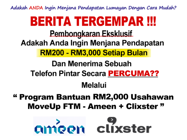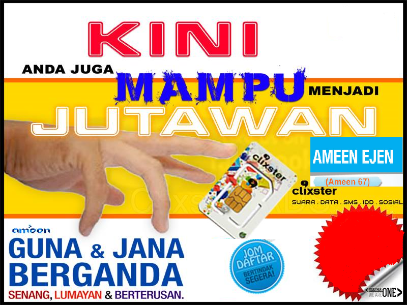 Bantuan Modal Serta Krusus Keusahawanan Di Sediakan..Percuma Telefon Pintar Pilihan Anda.Sertai Kami Sebagai Usahawan Telekomunikasi Clixster Sebagai Ejen Ameen.Pendapatan PASIF INCOME Puluhan Ribu Ringgit Setiap BULAN menanti Anda.